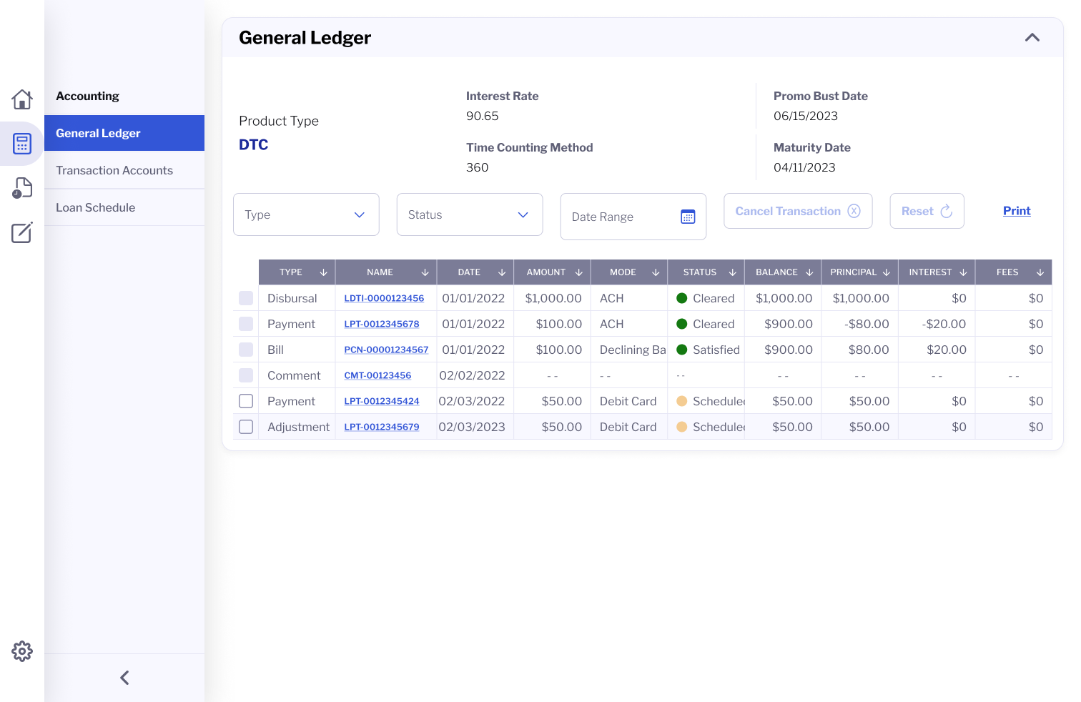 Transaction detail modal within the General Ledger view of a loan servicing platform.